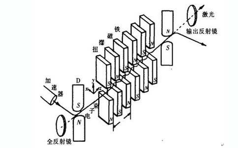 從加速器輸出的相對論電子束橫穿過周期性變化的波振器靜磁場。磁場方向與電子束垂直,故穿過的電子束被迫進行橫向振蕩,并向前方發(fā)射磁軔致輻射。在高能電子和光子的散射過程中,電子運動方向上的散射光子的頻率可由能量和動量守恒定律決定,波振器使聚焦的電子束在與光子束相互作用的整個過程中,始終保持在直線方向上。當電子束和光子束密度足夠大時,便形成受激散射,產(chǎn)生自由電子激光。自由電子激光器的輸出激光波長與電子能量有關(guān),改變電子束的加速電壓就可以改變激光波長,這稱為電壓調(diào)諧。其調(diào)諧范圍很寬,原則上可以獲得任意波長的激光。